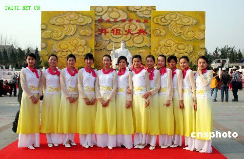 9:00,车队行至人民东路古城墙口第一牌楼——《迎亲楼》门前停车,全国人大副委员长何鲁丽,全国政协副主席张思卿、罗豪才,河南省委书记徐光春、省长李成玉、省政协主席王全书、省政协副主席陈义初、郑州市政协主席杨惠琴参加盛世迎亲仪式。新郑市委书记、市长迎接。 新郑市委书记赵武安致简短的欢迎词;新郑市市长吴忠华向全国人大副委员长何鲁丽赠送黄帝故里——新郑的城门钥匙;少年儿童向参加仪式的领导赠送鲜花。然后乘车继续向前行驶。 9:08,车队从第一牌楼向黄帝像环岛前行。行至黄帝像环岛处,行进中观看《盛世锣鼓》。 9:13,车队行至炎黄广场第二牌楼——《祈福楼》。车队过牌楼后,领导从广场东侧下车,沿专用通道观看广场旗阵、武术、太极表演。而后从广场西侧出,登车从人民路炎黄广场向故里广场行进。 9:25,车队通过仿古街行至轩辕广场入口处第三牌楼——《昌运楼》前,进入轩辕广场,领导下车,56个民族舞蹈表演开始,领导接受敬酒。 9:30,清洒甘霖,穿拜祖服,佩戴黄帝丝巾。河南省委书记徐光春、省政协主席王全书、郑州市委书记王文超接受洒水、穿衣,其他嘉宾佩带黄帝丝巾。 郑州市市长赵建才迎出牌楼向主拜人报告:“各位首长!我是郑州市市长赵建才,丙戌年黄帝故里拜祖大典各项仪程准备完毕,请各位嘉宾入场!”四位武警礼兵引领嘉宾入场。 9:43,主会场欢迎仪式开始。 欢迎仪式由央视主持人主持,河南省政协主席王全书主持拜祖大典。 9时50分,拜祖大典正式开始。 主司仪王全书主席宣布:各位嘉宾,我宣布丙戌年黄帝故里拜祖大典开始。 第一项:请郑州市委书记王文超先生致欢迎词。 第二项:全体肃立,鸣炮34响,代表全国34个省。 第三项:党和国家领导人、省市领导分三组向黄帝像敬献花篮。 第四项:点火上香,由奥运会冠军陈中点燃圣火,主要领导和来宾分三组向黄帝像上香;全体来宾向黄帝像行施拜礼。中国国民党副主席江丙坤上香。 第五项:行施拜礼:全国人大副委员长何鲁丽、全国政协副主席张思卿、全国政协副主席罗豪才领拜。 第六项:河南省省委书记徐光春恭读《拜祖文》 全文: 春风荡漾,万象更新。维公元二00六年三月三十一日,农历丙戌年三月初三,中共河南省委书记、河南省人大常委会主任徐光春谨代表河南九千七百万人民,在中华人文始祖轩辕黄帝的故里、故都--新郑市,拜祀始祖轩辕黄帝曰: 具茨巍巍,溱洧泱泱。 轩辕之丘,天降轩皇。 圣明睿智,光耀朝阳。 赫赫伟绩,惠泽八方。 先民之世,天蛮地荒。 继炎而起,肇造华章。 甲子算数,律吕岐黄。 六书制作,文字辉煌。 舟车指南,五谷蚕桑。 修德振兵,铸鼎开疆。 设官司职,政体滥觞。 宇内一统,万民景仰。 二十五子,分姓六双。 代代有继,尧舜禹汤。 龙脉赓续,乃至今昌。 世界文明,彰显华邦。 三个代表,指明方向。 立党为公,民本至上。 改革开放,人神共襄。 多党合作,国是共商。 发展经济,民富国强。 先进文化,人人分享。 神六飞天,民气高昂。 中华儿女,再谱新章。 炎黄子孙,五洲六洋。 海外同胞,念祖思乡。 海峡两岸,骨肉情长。 统一复兴,义不容让。 科学发展,振兴总纲。 中华民族,雄立东方。 中原儿女,奋发向上。 农业先进,工业兴旺。 科教发达,环境优良。 社会和谐,人民安康。 英才辈出,自强争光。 中部崛起,指日可望。 黄河滔滔,嵩岳茫茫。 缅怀祖德,光大发扬。