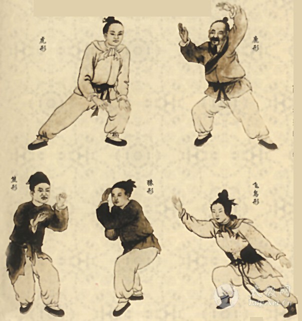 前言:学过郑子太极拳的同好,在初学此拳时可能都会学到行功,熊经,松身五法或是五禽戏等,以下稍加介绍这些功法,首先是郑曼青先生对五禽戏中的熊经的文章。 东汉华陀,字元化,人称神医。创五禽戏,为却病强身法,乃良医医未病者之妙用也。初见於庄子刻意篇,引上古之尚气者,曰能经鸟申。释者谓熊能上树。曰经;错矣。经则常也。以熊终日摇摆腰膂,是为熊经,又释鸟申为频呻,亦错矣。申即屈伸也,以鸟伸其翅与足也。旋又见谓熊经鸱顾。此有进乎熊经之说,以熊经时,乃垂头摆腰,加以鸱顾者,乃平视也。华元化,盖善於养形,而能却病,惜乎生将百龄,而为曹操所杀。创五禽戏,即本熊经之意。曰熊,曰虎,曰鹿,曰猿,曰鸟。古即以一禽字,包举为禽兽也。其运动之主旨,得最警策者,六字,曰:能使谷气得消。吾国五千年来,乃尚谷气养人,岂浅陋者所能知也。视今之所谓营养者,正相反,不知何脏何腑,需要营养,多致大病杀人,飞蛾扑火,亦自取之,不忍言也。然五禽戏之妙法,失传已久。惟其所谓致出汗二字,夏日炎热,微汗则可。 秋收冬藏,运动至背与额,觉微有芒剌象,便止,不使汗出也。五禽戏,余补作之何难。不过自张三丰,倡太极拳后之今日,其理论至为精密,意义亦甚深奥,决非其他运动可及。五禽戏之不逮,亦已远矣。惟太极拳,确能行运而后动之妙趣,尚气导引之上乘也。非张真人造诣功深,安能及此。余仿欲与老病及赢弱者,传一熊经之戏,至简至易之上古妙法,岂却病延年,反弱为强而已,进而求自卫,与臻上寿之方,垂手可得。兹略系以简介数言,倘能持之以恒,得能以运气百日,自见其病体与赢躯,必有显著之进境,一切疑难之症,无足虑也。此真强身之宝筏,非瓦釜之作雷鸣可比,且行熊经一戏,可兼得鸱顾,及五禽之戏,与太极拳运动之妙用。万金易得,一法难求。勿自交臂失之,致使数十寒暑,匆匆付与东流也。 附述熊经必须注意者,三点如下: 一、熊经乃熊之经常作动,向左古捩转腰膂不息,人须早晚饭后半小时行之,体弱者,可自二百动开始行之,或三百动,每隔五日、或七日,递加五动、或十动。只许加,而不许减。故宜缓进,不宜欲速,加至十分钟、或最高至十五分钟,不加矣,必须求适意,以轻松愉快为得也。 二、行熊经时,不可如熊之垂头,乃兼有鸱顾,求平视,头不许动,随身与腰转捩。即太极拳所谓,虚灵顶劲,尾闾中正神贯顶。 三、熊经须如太极拳,要虚实分清,重如山岳,轻如鸿毛。譬如腰左转,重心全在左腿,重如山岳。右腿,则轻如鸿毛矣。右转亦如之,如此而已。 苟能得如上述三点要诀,则金鸡独立稳矣。倒撵猴,不让灵猿之进退矣。抱虎归山,便如虎 虎之有声矣。左右顾则,斜飞势,必捷於鹿矣。而五禽与太极,则一戏乃兼得之矣。惟行之者,务须注意,以心与气相守丹田,丹田在脐下一寸三分,犹须足心蹋地耳。 二、熊经--郑曼青先生对熊经之问答 问:「熊经为至简至易之上古妙法,岂止却病延年,反弱为强而已,进而求自卫,与臻上寿之方垂手可得。」。「进而求自卫」请再示其详。 答:熊经除强身却病之外,亦为太极拳之阴,搂膝拗步是太极拳之阳手。余昔年在长沙,任湖南国术馆长时,曾一日行至挚友处,未至门口,忽有家犬突击背后,当时不知何物,未及走化,只顺势一掌,狗未吠而自去,次日登门,友说:「该犬已难张嘴食物」,此即熊经之自卫也。 问:师说:熊经倘能持之以恒,得能运气百日自其病体与赢躯,必有显著之进步,一切疑难之症无足虑也,其中「运气百日」未悉如何? 答:熊经之运气,乃是练五心相通。五心者,涌泉「脚心」,劳宫「掌心」,与百会「顶心」之合称,相通即气机相通而连贯。 (1)腰膂左右捩转时,脚跗放松如绵,脚心贴地,得地气(按地之力),导引向右掌心,使右掌心在捩转时,有一种气机通顺之感觉。这种感觉,有热、胀、麻、痛,甚至痒。 (2)左右捩转时,捩转之意境,非凭空旋转,而是指上下有根的旋转。故捩转时,顶心有似有似无的根,必须与掌心脚心相吻合。故须注意虚灵顶劲,尾闾中正神贯顶。 问:熊经师说要领,未提呼吸,应否注意: 答:呼吸为帮助行气,非炼气。初习时,应以自然呼吸,以太极之理,静慢细长,熟练之后,重心移动时,宜吸气,捩转时为呼气。 问:师说熊经仅提为熊之经常之动作,未提手该如何?未悉其然,请再示其详。 答:妙手之动作,亦为大极拳之理也,太极拳不动手,熊经亦是,习熊经双手不动,宜虚抱元而守一。元「圆」之古音,守一,乃心与气相守於丹田。