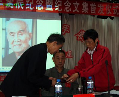 何淑淦老师讲话 上午8点30分,大会主持人李驻军先生致开幕词,济南的刘秀文老师演讲并向洪均生公敬献其搜集整理出版的《洪均生先生诞辰100周年文集》,由洪先生的大弟子何淑淦先生代收。何淑淦先生深情地回忆了当年追随洪均生老师学拳的经历以及洪公待人诚恳,勤俭朴素的崇高人品及武德,说到动情处,声泪俱下,令在场的所有人为之感动……随后,洪均生先生的再传弟子们一一发言,阐述自己在习练洪均生先生所传拳法的心得体会以及对他的深切怀念。