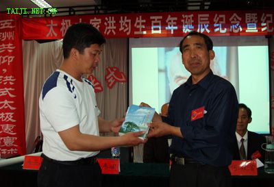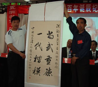 做为太极拳发源地陈家沟的代表,村长张蔚珍与中国陈家沟太极拳推广中心秘书长原福全先生向大会赠送特意请书法家为洪均生公书写的题词“尚武重德,一代楷模”,李驻军老师代表国际洪式太极拳推广中心回赠了《洪均生先生诞辰100周年文集》,并衷心的感谢陈家沟来宾的支持。洪均生的弟子、徐州蒋家骏先生也向大家展示了自己收藏的洪老的太极理论书法作品和1994年洪老88岁时书写的“洪式太极”四个大字。