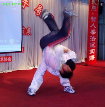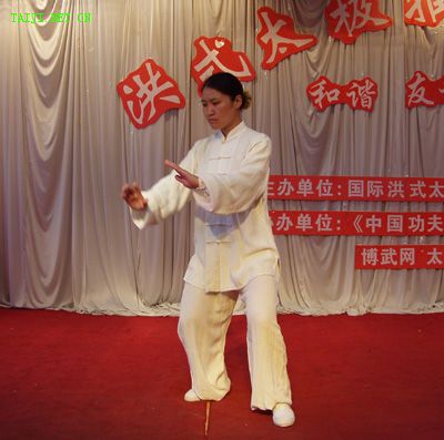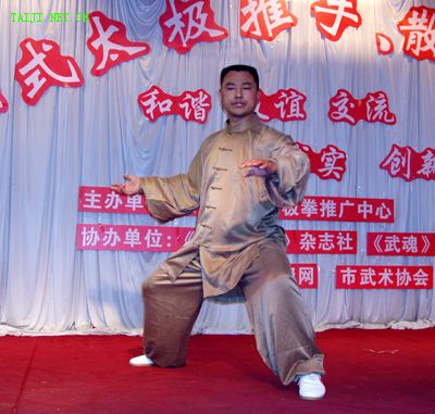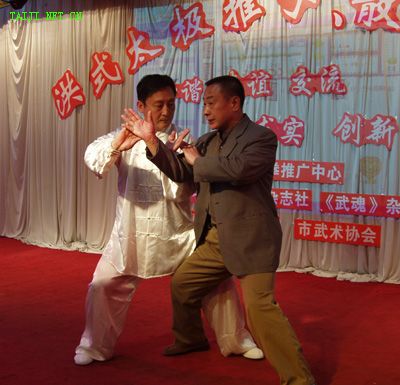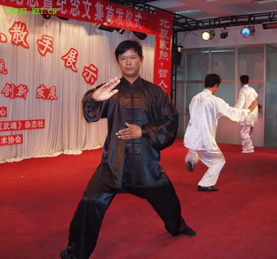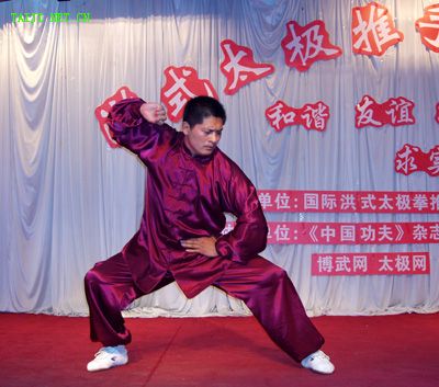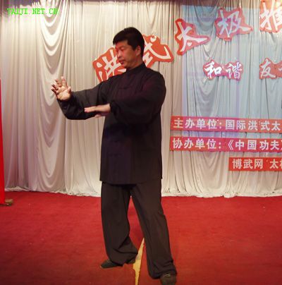 李驻军演示拳法 接下来进行太极拳套路与推手的演示,李驻军老师表演了洪式一路拳,陈志强、陈骁伍等太极名家也做了精彩的表演,他们的表演,细腻绵长而又刚猛十足,赢得了观众的热烈掌声。