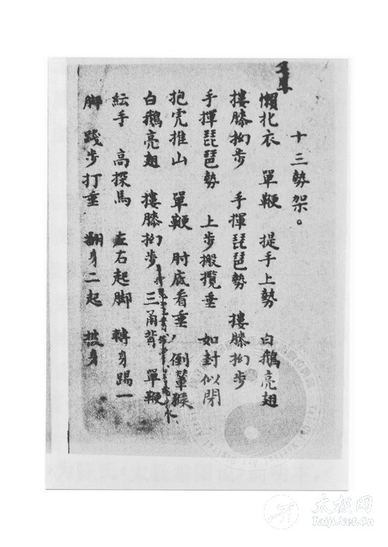 习太极拳者不可不知王宗岳。但王宗岳其人其事如何?岁月没有为我们留下他更多的踪迹。从李亦畬手抄本“老三本”中首次以确定的文字形式披露“王宗岳”这一大名后,有关王宗岳的寻找就没有中止过。王宗岳是站在太极拳理论顶峰的人物。研究王宗岳,是我们开展太极拳理论学习的重要一环,事实上对我们认识太极拳历史也必将有重要帮助。许多专家有此热心,众多爱好者有此要求。为此,对这一话题进行专门探讨,得新收获。也许发现之旅很艰难,但这个过程不也很有趣味吗? 松下问童子,言师采药去。只在此山中,云深不知处。 为人莫忘本,饮水当思源。欲修太极拳,须敬王宗岳。王宗岳宗师留给世人的“太极拳论”、“十三势”、“十三势行工歌诀”、“打手要言”、“打手歌”五篇拳论,意蕴精深,见解独到,可行可作,奥妙无穷,是太极拳修炼的经典指南和圭臬。 对于王宗岳宗师太极拳理论,笔者虽孜孜求之,然因生性愚钝,学识浅薄,迷茫困惑之处多多待究。现先将关于王宗岳宗师《太极拳论》之习悟与求答思绪疏理归纳出来,以求教、求答于前辈同道: 1、何为“无极”?何为“太极”?何为“阴阳之母”?“太极”由“无极”而来,太极拳修炼,久久为功,最终追求的目的,是否是返璞归真,寻本溯源,“心”耶,“身”耶,回归到“无极”态势? 2、“动之则分,静之则合”,“动”是“阳”,“静”是“阴”吗?“分阴分阳,显阴显阳,阴阳相离、相悖、相乖”,是“阴阳之母”吗?笔者感到“动之则分,静之则合”,是指形体外面的动、静、分、合变化,不论“动分静合”,其内意、内气、内劲、内在,都是由“阴阳相融、相和、相济”的“阴阳之母”来支配与操纵。这种体悟对吗? 3、何为“无过不及,随曲就伸”?在太极拳推手练功中,如何由尺而寸,由寸而分,由分而厘,由厘而毫,于毫厘微末之间,理解、把握、求索、获得“无过不及”呢?过者,过头也,顶也,抗也;不及者,丢也,扁也。“不丢不顶”,是否源于起处?而根据“无过不及”,将“不丢不顶”改为“无丢无顶”,岂不更有利于操作、修持吗?深层次的“无过不及”是否是用“意”、用“气”、用“神”呢? 4、“人刚我柔谓之走”,是否应当包括“左重则左虚,右重则右杳;仰之则弥高,俯之则弥深;进之则愈长”自我形体诸方面的变化?“我顺人背谓之粘”,是否是对方“退之则愈促”呢?这里的“退”,不可单纯理解为对方的“退步”和“退走”,而是指对方的“背”势和被动。笔者浅见,君以为然否? 5、“动急则急应,动缓就缓随”,应当如何理解“急应”呢?笔者以为“应”,应当是形体毫厘微末之间“本地风光”“有感而应”“有响即应”的瞬间变化,其变化之关键不在外面,而在内里。笔者感悟,不知妥否? 6、“由着熟而渐悟懂劲,由懂劲而阶及神明”。“着熟”是否是“形、体”“有意识”的自我“自动”的“感觉”变化行为?“懂劲”是否是“意、气”“无意识”的“自发”自然的“感知”变化行为?“神明”是否是“神意”“下意识”的“自然”而然的“感应”变化行为?有的爱好者不求“着熟”先求“懂劲”,对吗?“由着熟而渐悟懂劲,由懂劲而阶及神明”,是否是太极拳“练精化气,练气归神”的整个修持程序和过程呢? 7、何为“一羽不能加,蝇虫不能落”?在太极拳行功中如何操持?此与“一羽不准加,蝇虫不准落”,有何本质区别? 8、“人不知我,我独知人”,达此功夫,可否理解为,自我形体变化此时“身形如水,遇阻则止;身形如气,逢隙则人”,知己知彼,百战不殆,而仁者天下无敌?对于“英雄所向无敌”,不可望文生义,理解为“英雄走遍天下无敌手”。 9、“察四两拨千斤之句,显非力胜”,在太极拳推手练功中,用“力”能获得“四两拨千斤”技艺吗?关于“显非力胜”,是否也可以这样体悟,“四两拨千斤”的功夫,“显然是用力不能胜任的”。“观耄耋御众之形,快何能为?”,在太极拳推手练功中,以“快”能获得“耄耋能御众”的功夫吗?对于“快何能为”,是否也可以这样体悟,“耄耋能御众”的功夫,“凭借快是不能获取的”。太极拳功夫,是慢功夫,精功夫,细功夫,需精雕细刻,久久为功,方可获得。太极拳功夫,人到耄耋之年,对于功夫的理解更精深、更精细,这就是太极拳功夫之所以能够“益寿延年”的真谛、真义、真经所在。对此,不知君以为然否? 10、“立如平准”,“平准”是指“天平”吗?“立如枰准”,“枰准”是指“称”、“秤”,吗?天平、称、秤,是王宗岳宗师的本义吗?太极拳名家吴文翰老师说:“汉代设平准署,司调剂物价等事。宋因避寇准讳,改准为‘准’。王宗岳用此典以喻走架打手身势要不断保持平衡,故武禹襄阐述为‘立身中正安舒,八面支撑’。因李亦畲手写本《太极拳谱》将‘平’写作‘枰’故后人有的释为秤(称),也有解释为天平的,皆非原意。因未知此典之出处也”。 11、“活如车轮”,是指“身形灵活”?还是指“内气流动”?还是指“形也转,意也转,挨着何处何处转”?如何才能“立如平准,活似车轮”,必须谨记“虚领顶劲,气沉丹田,不偏不倚,忽隐忽现”太极拳修炼四大要领。 12、“偏沉则随”,是太极拳要领?还是拳病?太极前辈董英杰先生、王新午先生,当代太极拳名家冯志强老师、孙剑云老师,当代太极拳学者余功保先生,均认为“偏沉”为病。对此,君以为如何? 13、“
