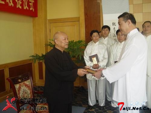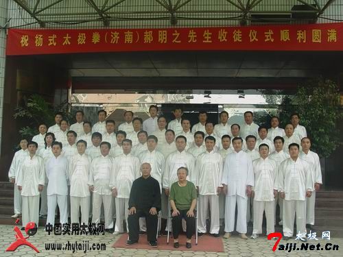 | 今天160余名太极拳爱好者欢聚一堂,参加著名太极拳家、杨式太极拳第六代传人—郝明之先生的收徒仪式,郝先生系济南市杨式太极拳研究会会长,师承杨式太极拳第五代传人刘仲桥先生;郝明之先生习拳五十多个春秋,在继承传统的基础上,经多年细心揣摩,形成舒展大方、浑厚沉稳、气势磅礴的拳架风格,被录入《中国武当武术家大辞典》,先生性情和善、为人忠厚、在武林界德高望重、深得弟子和学生们的爱戴,为弘扬太极文化、普及全民健身运动,根据众多太极拳爱好者的迫切要求,为满足部分从学拳者的要求,经先生经年考察,和弟子们的慎重推荐、筛选,今天有46名新人拜师入门。