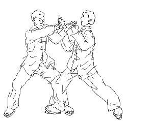 甲乙双方在旋转、缠绕对抗之中,乙松右胯,身体略稍右转,并将甲的左手向下按,使之置于对方小腹前,随即向右外拨动,然后继接迅速提起左手向前