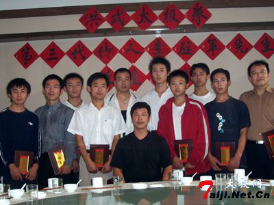 李驻军老师和新入门弟子合影 2006年10月4日,洪式太极拳第三代传人李驻军老师在菏泽学院雅苑宴会厅举行收徒仪式。来自南京、常州、济南、青岛、日照、淄博、菏泽等地的张勇、王镇、张磊、李再凯、王海洋、吴其亮、高国辉、蒋猛、焦胜立、张曦书等十名学员拜在李老师门下,成为洪式第四代弟子。