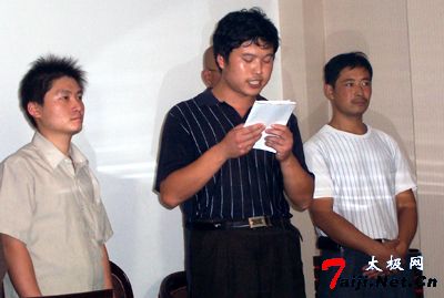 李驻军老师向新入门弟子训话 张勇、王镇等同学是在跟随李老师学拳很长时间后,经过老师考察,认为人品好又能刻苦练习太极拳,能够继承洪派艺术而被老师收为正式徒弟。收徒仪式上,李老师向新入门的弟子颁发证书并介绍了洪式的源流、发展,以及近年来所取得的成绩,鼓励他们献身太极事业,为人类健康工程做贡献! 李老师的师兄弟高富宽、马菏东、马保国、郑关中、李雷等先生作为引进师和见证人参加了收徒仪式。何淑淦先生因故未能参加这次活动,专门委派弟子荣捷宣读贺词。济南等各地洪式同门闻听信息后也纷纷来电祝贺!
