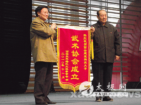 会上,建大工会常务副主席江中文宣布武术协会正式成立。随后,建大党委副书记王秉琦代表学校副校长王晓昌颁发武术协会会长聘书。王秉琦表示,武术协会的成立不仅能丰富校园文化生活,同时也能促进我校师生体质的提升,他祝愿武术协会能够发展的越来越好。随后,武术协会会长、副校长王晓昌为武术协会顾问及各机构成员颁发聘书。王晓昌表示,对于武术他虽然是个门外汉,但他会用自己饱满的热情和执着的精神为武术协会工作,他希望武术协会能在各职能部门的努力下取得长足的发展。 西安市武术协会常务副主席王培仁致贺词 西安市武术协会赠送贺礼 西安市杨氏太极拳协会赠送锦旗 |