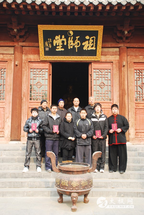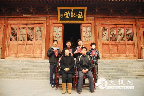 师徒合影 整个拜师仪式简洁而又庄重,陈自强师徒分别向太极拳始祖恭拜敬香,告知太极拳先祖陈氏太极拳门墙又列新丁。四位弟子向师父、师母递交拜师帖和拜师礼,师父、师母回赠礼物,颁发入室帖。 拜师仪式结束后,师徒在祖师堂前合影留念。 见证人和师徒合影 |