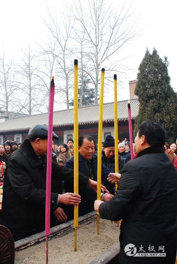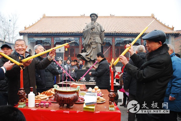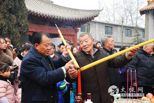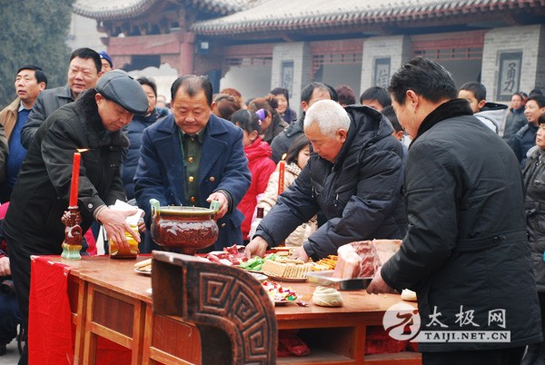 | 陈氏家族理事会一大早就准备好了香案、祭品,陈氏后人按照家族传统来到祖祠内,等待祭祖仪式开始。上午10点,陈氏家族理事会负责人宣布祭祖仪式开始,鸣炮、上香。全体族人集体向陈氏祖先祭拜后,陈氏十七世、十八世、十九世依次接受后辈鞠躬致敬。 陈正雷大师代表太极拳师向父老乡亲拜年,并做太极拳汇报表演。祭祖仪式结束后,陈正雷大师在接受太极网的采访时说,“陈家沟是生我养我的地方,水流万里不能忘其源,树高千尺不能忘其根,请家乡父老放心,我无论走到哪里都不会忘记家乡,发展再大也是为家乡服务!” 陈氏族人准备祭品 点香 敬香 |