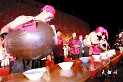 由于精武体育会“爱国、修身、正义、助人”的宗旨在武林界影响深远,本次庆典活动,佛山本地的武馆,美国、澳洲、港台、内地各省市的精武会以及其他武林同道1800多人纷至沓来。 昨天上午9时,庆典活动在兆祥公园举行的全国优秀全民健身活动站、精武会全民健身模范点的揭牌仪式中拉开序幕。随后,来自佛山和全国各地的武林人士和社会贤达相聚“传统武术文化之发展”论坛,对武术今后的发展方向提出各自见解。 下午2时30分,精武会演武场内金鼓齐鸣、八狮贺寿,一台名为 “精武之光”的“武”艺会演热闹开场。讠永春拳、少林拳、白眉拳、洪拳、龙形拳、太极拳以及来自山东的螳螂拳纷纷登台,让现场的人大饱眼福。 表演一直持续到夜幕降临,“千人夜宴”正式开席。就在这台很有武林味道的“夜宴”开始不久,一位七旬老翁便挑着两大坛子酒走上舞台。而此时,台上已经摆好了一堆大碗。随着精武会会长梁旭辉等人举起装满米酒的碗,近百桌千人也一起举碗庆祝。 对于举办本次佛山精武体育会创会庆典,梁会长表示,整个活动除了突出精武会85周年的历史以及展示精英辈出的局面外,也为了向更多的人宣扬精武精神。他表示,精武体育会一直都是本着爱国、修身、正义、助人的会训立足于社会,也一直努力为创建和谐社会做贡献。 “虽然现在武术还没有成为奥运会的比赛项目,不过对于后辈人才的培养还是不能放松,佛山精武会在这个方面起到了它的作用。”市体育局副局长任结勤表示,社会要和谐,武林也要和谐,由于佛山的拳种门派比较多,佛山精武会在团结各大拳种和门派,构造佛山乃至全国的和谐武林将起到积极作用。 |
