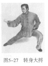 大捋是大幅度转体作捋势的意思。太极拳推手练习中的活步推手有大捋的训练内容,是四隅手活步训练的方法。主要手法是掤、捋、挤、按、采、捌、肘、靠的联合运用。 48式太极拳吸收了大捋的动作特点,编成招式,纳入套路中。 “转身大捋”式的起始动作怎样做才更符合规定要求? 由前式“马步靠”定式开始,在重心后移时,腰微向右转,左腕须外旋,左拳变掌上托,右手亦轻微内旋,使两拳掌心向右,随同上体左转,双手向右旋转,如托球向右搓动状。左脚尖同时上外撇,上体左转,重心移向左脚,右脚随即向前上步与左脚平行,相距约10 厘米,膝自然站直,成平行步,面向正起势方向。此时右臂边旋边伸展,右手掌心向上托举,左臂屈肘,左掌旋腕提至胸前,掌心向外,拇指向下——这是“转身大捋”式的前半招动作。动作过程要比较细腻,一丝不苟,做到每一缠绕动作都有交代,接下去才是捋势的本 体。 “转身大捋”式的定势有什么意识表现,步型、身法、手法的要求怎样? “转身大捋”式的定势,技能意识在滚肘撅臂,如同左手握对方左腕,右手托对方左肘臂,向左后捋动对方,骤然旋左手扭扣对方左腕,使其左臂被反关节。同时略曲肘滚动右前臂,旋压撅截对方肘部以折其臂。这就是该势的意识所在。动作时决不可做成双手抓拳同时屈肘向左腰侧牵拽,这样做显得轻浮而失势,也不符合本式的理法要求。 完成该式时,步型是横裆步,左腿弓,右腿自然伸直,步幅较大,架势较低,力量主要集中于左腿(如图5-27)。上体正直,面对右拳方向,松胯塌腰,气向下沉,并必须做到敛臀,裹裆,护臀。手法就是由捋而滚肘缠绕,目的是撅断对方前臂。用力点是自己的右前臂尺侧,用于对方身上的着力点则在对方反关节的肘尖部。 |