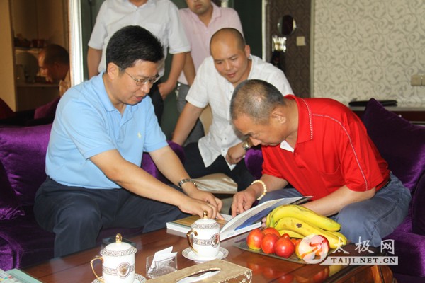县长李英杰与央视武林大会总裁判长蒋家骏就《走进陈家沟》大型比赛活动进行深入交谈