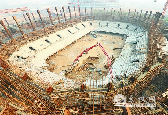 昨日上午,焦作市国际太极拳文化交流中心暨全民健身中心建设项目传来喜讯,该建设项目之一的太极体育馆主体工程基本完工。据悉,该工程建筑面积29950平方米,总投资29241.33万元,建设内容主要包括比赛场地、热身场地、看台、电梯、各类功能区用房、技术用房、给排水、暖通空调、消防设施、电气工程、无障碍设计等,可容纳观众7842人,主体为地上三层建筑,总高度29.651米,檐口高度14米,结构形式为钢筋混凝土剪力墙结构。图为太极体育馆主体工程。 |