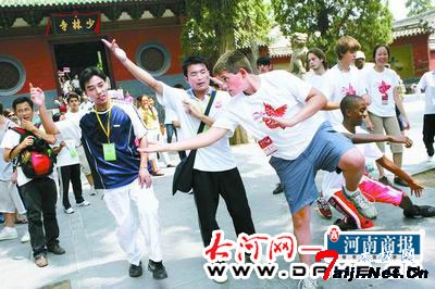 外国中学生少林寺门前摆招亮式 昨日,来自美、英、韩三国的211名中学生走进向往已久的千年古刹少林寺,跟随“武林高手”学习中国功夫。 |