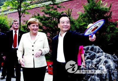 德国总理默克尔访问中国和温家宝总理一起练习太极球 2006年,在天安门广场东侧的菖蒲河公园晨练的人群中多了两位“稀客”:一位是上任后首访中国的德国总理默克尔,一位是陪同她感受“中国式晨练”的中国总理温家宝。 “你们认识这位女士是谁吗?”温总理似乎有意要测试一下德国历史上第一位女总理在中国的知名度。“认识,认识,我们都在电视上看到了女总理上任的消息,恭喜她啦。”人群中很快就有人答对了温总理的提问。 “祝你的全家都生活幸福。有机会你一定来德国看看,德国人民十分欢迎来自中国的朋友。”默克尔向正在练太极拳的退休医师李建美发出了盛情邀请。 如果说默克尔对太极拳还曾耳闻目睹,柔力球对于这位女总理来说,则完全是新鲜玩意儿。默克尔尝试着这种类似于将网球控制在球拍上展转腾挪的运动,似乎不太得要领。 “我来给你示范一下。”温总理说着,接过了默克尔手中的球拍。几个漂亮的挥击、展转,小球就像粘在球拍上纹丝不动,温总理的娴熟球艺引出了晨练人群的阵阵叫好声。 “你是不是也经常锻炼?”默克尔满眼好奇。温总理面带微笑,颔首称是。随后,两人在公园河边的林荫道上漫步,边走边聊着共同关心的话题。