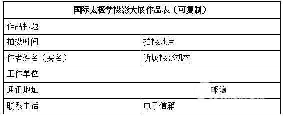 作者必须在腾讯网图片频道“国际太极拳摄影大展”用QQ号注册(http://pp.qq.com)并按要求填写真实个人信息。每个QQ号限投99幅作品,如超过上限,请更换QQ号登陆并继续上传。主办单位保证不公开或泄露投稿个人非公开信息。投稿作品为jpg格式,图片统一处理为长边600-1000像素,文件大小控制在500K以内。对于投稿作品,工作人员将初步审核,符合要求的作品将放置于活动网站的作品展示页中。