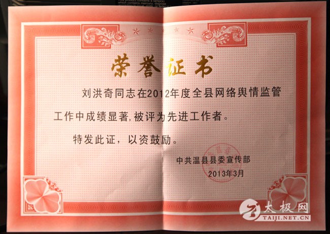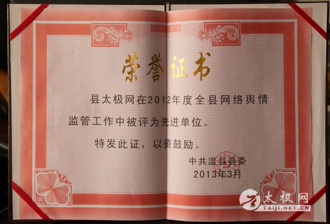 | 2013年3月14日,温县召开宣传统战工作会议,表彰了2012年度宣传思想文化工作暨精神文明建设先进单位。太极网、陈家沟太极拳学校、陈家沟武术院等单位被县委予以表彰。太极网总裁刘洪奇被县委宣传部评为网络舆情监管工作先进工作者。 会议对2013年的宣传和统战工作做了部署。温县县委副书记黄腾,县委常委、宣传部部长冯志斌,县委常委、统战部长郑爱珍出席会议。 |
