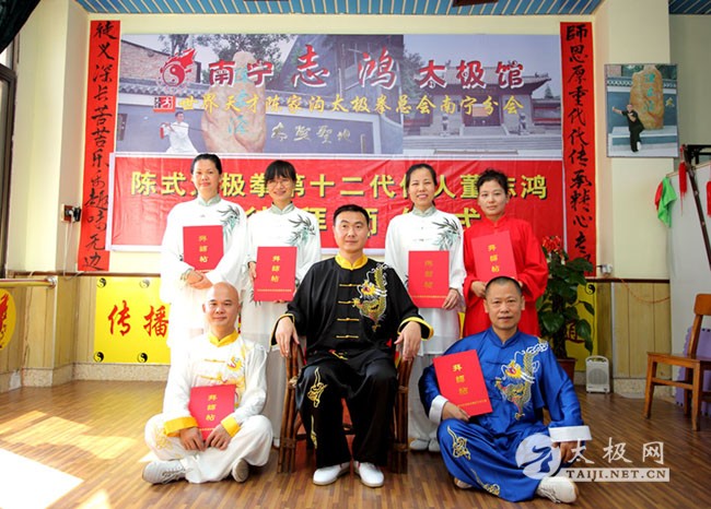 2012年10月,董志鸿老师开始开门收徒。2013年5月11日,董志鸿老师在绿城南宁又喜收谢青蔚、彭培新、伍万华、黄群、李珊、汤燕六名弟子,为陈式太极拳在广西的发展又播下了六颗金灿灿的种子。