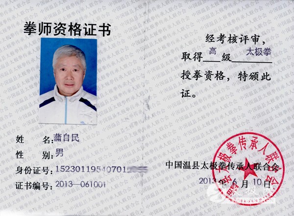 蒲自民,男,1954年出生,重庆人,师承赵洪生。 2001年随师父赵洪生习练陈式太极拳,2011年被中国武协授予武术5段。 2011年开始授拳,被黑龙江省尚志市太极拳协会聘为教练、内蒙古通辽市科尔沁区拳工委教练。 2012年获得国家体育总局社会体育指导员证书。 |