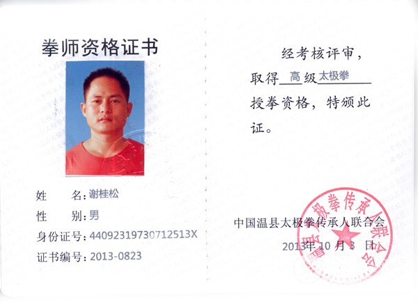 谢桂松,男,1973年出生,广东电白人,师承张东武,陈式太极拳第十三代传人