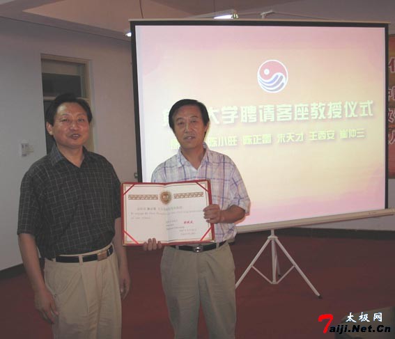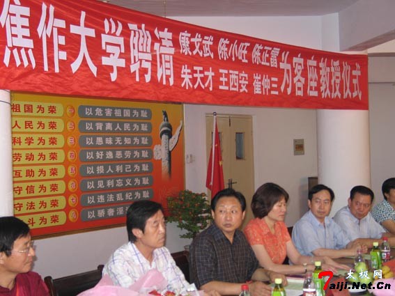 8月24日下午,焦作大学隆重集会整个校园喜气洋洋,康戈武、陈正雷、陈小旺、朱天才、王西安、崔仲三等六位武术界大师级人物被焦作大学聘为客座教授。 在聘请仪式上,焦作大学校长林效廷分别向大师们颁发了聘书和纪念品,大师们也分别向学校赠送了自己的书籍、光盘等作品。康戈武、赵功佩、霍金花等领导分别讲话,祝贺焦作大学率先开办太极拳学院,希望焦作大学努力把太极拳学院办成培养输送高素质太极拳人才的摇篮,希望大师们为太极拳事业做出更大的贡献。大师们纷纷表示,要充分利用这一平台,尽自己的努力,为太极拳事业地发展做出自己更大的贡献,为太极圣地增辉,为家乡人民添彩。 聘请仪式后,大师们应邀为学校题词,陈正雷大师挥毫题词:“太极传友谊”“太极神韵”于焦作大学,表达了对太极拳事业的发展寄予了殷切的希望。 在此以前,陈正雷大师已被国内外多家高等院校聘为客座教授;如洛阳师范学院、河南师范学院、美国加州大学尔湾分校等院校。陈正雷大师以他在太极拳方面的高深造诣,以及数十年如一日对太极拳的执着与热爱,得到了举世的尊重与认可!  受聘仪式上