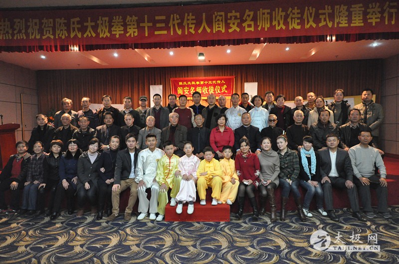 2013年12月1日上午,陈氏太极拳第十三代传人阎安名师开山收徒仪式在西安宝湾商务酒店隆重举行。 仪式由西安萃华武术馆副馆长宋长平主持,陈永福大师,职宝贵老师,赵正荣老师担任鉴证人。西安武术协会副秘书长刘永强先生,萃华武术馆馆长陈永福大师发表了热情洋溢的讲话,对收徒仪式表示祝贺。陈永福大师和阎安名师先后向陈氏拳祖和历代宗师上香叩首。证人和师父师娘入座后,拜师弟子阎俊松、宋文洁、张仪隆、周星宇、宋得五人按顺序在台下站立,由阎安名师宣读了陈氏先辈门规戒律。阎俊松是阎安的儿子,属于亲传,按惯例不用呈帖,父母赠龙泉宝剑一把,以示拜师。随后宋文洁,张仪隆,周星宇,宋得按顺序上台,分别按宣读拜师帖,敬奉拜师帖,行叩拜大礼,师父签字发帖, 弟子向师父师娘敬茶,师父向弟子赠剑等传统拜师仪式,整个仪式进行的严肃隆重,充分体现了尊师重道的中国武术文化。 随后拜师弟子分别演练了陈氏小架36势,太极单刀,短棍,陈氏小架二路等太极拳套路进行了汇报表演。萃华武术馆副馆长职永成、樊小丽,九十岁高龄的民间老拳师于明智,红拳名家卢永民,萃华武术馆秘书长阎安进行了名家表演,分别演练了陈式大架,陈氏小架,鞭杆,螳螂拳,陈氏长拳108势等武术套路,其形神兼备内外合一的表演把现场气氛推向了高潮,迎来了阵阵掌声。表演结束后全体人员合影留念,通过这次活动,拉近了各武馆,协会之间的联系,给新入门弟子留下了难忘的记忆,必定会对陈式太极拳的继承和发扬起到积极的推动作用。