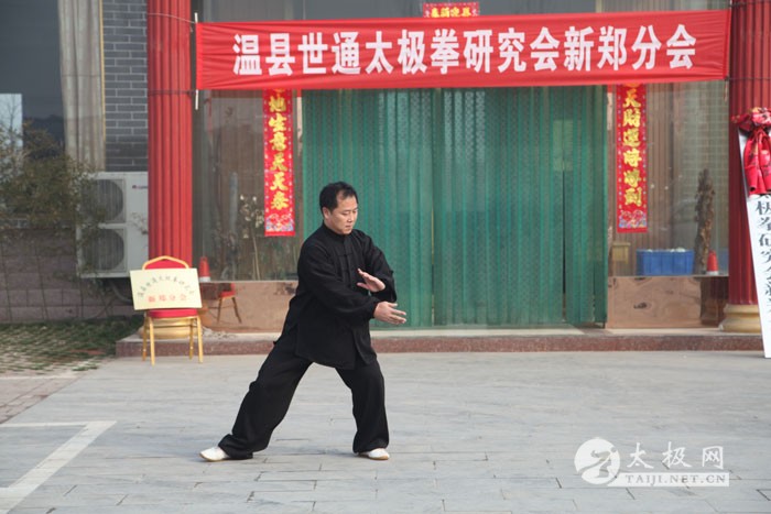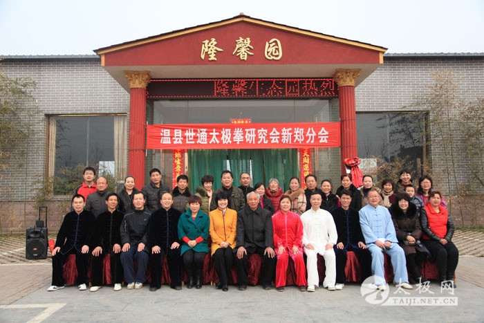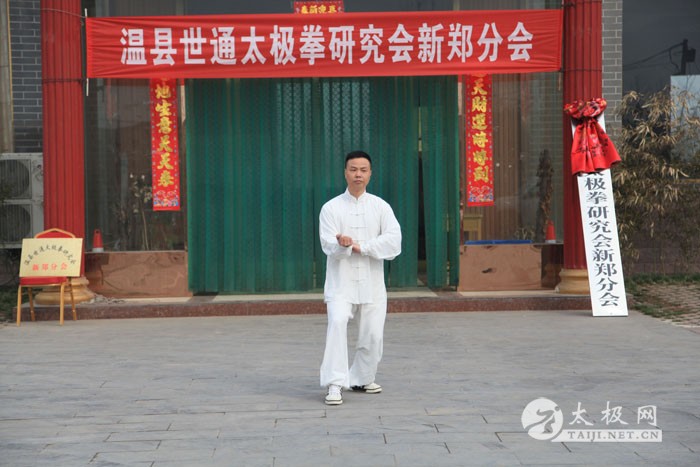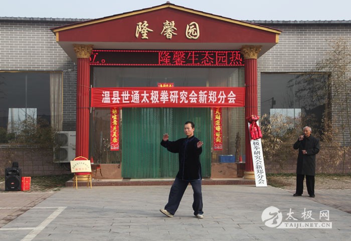 2014年3月2日上午,农历二月二,传说是龙抬头的日子,温县世通太极拳研究会新郑分会在新郑市隆馨生态园揭牌成立,新郑分会是在新郑市老拳师乔均喜先生的倡导下成立的。乔均喜出生于1949年,自幼喜爱武术,退休后更是将全部身心投入到了太极拳的传播和推广上,现任新郑市太极拳协会常务会长、温县世通太极拳研究会副会长、新郑市世通太极拳研究会分会会长、新郑市委老干部局轩辕太极队负责人及总教练,为新郑市的太极拳事业做出了很大贡献。温县世通太极拳研究会总会的领导陈世通大师之女陈军营、吴平利和太极网总编辑、温县太极拳传承人联欢会主席刘洪奇到场祝贺,新郑市太极拳协会会长敬红卫、新郑市人口计生委贾桂玲书记和部分新郑市的太极拳爱好者前来祝贺。揭牌仪式前,乔均喜的弟子和新郑市太极拳爱好者进行了精彩的太极拳表演,陈军营也应邀进行了传统陈家沟陈式太极拳的表演,赢得大家的热烈掌声。乔均喜老师最后为大家表演了陈式太极拳套路。