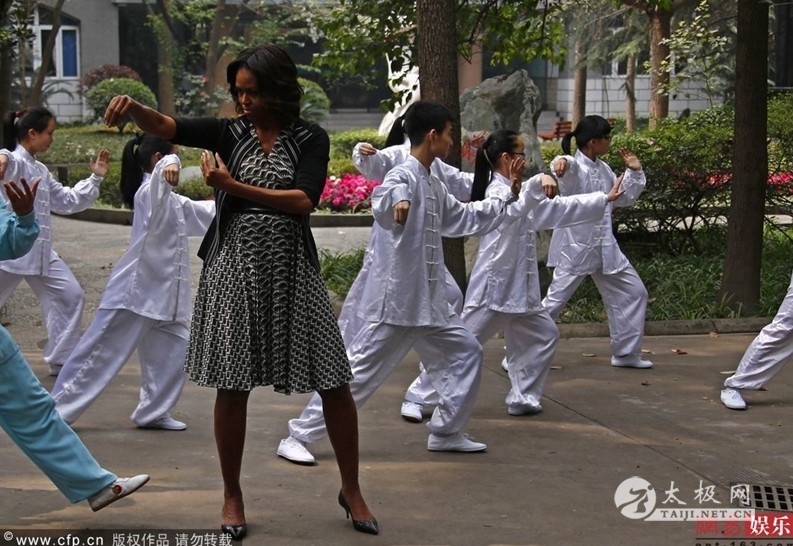 在参观成都第七中学时在校园里和老师同学一起学打太极拳。