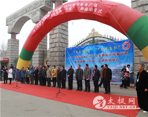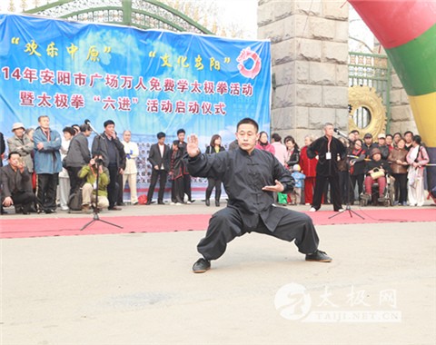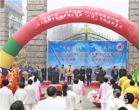 3月25日上午,安阳市人民公园群龙舞动,锣鼓喧天。公园内的广场上、道路上、树林中,到处是列队整齐身穿太极服的队伍,参与群众共有一千多人。8时30分,伴随着欢快铿锵的锣鼓声2014年,安阳市“欢乐中原、文化安阳”广场万人免费学太极拳暨太极拳“六进”活动启动仪式隆重举行。 市体育局副局长李保顺发表了热情洋溢的讲话。他指出,开展2014年“欢乐中原、文化安阳” 广场万人免费学太极拳活动暨太极拳“六进”活动,使太极拳走进学校、社区、乡镇、企业、机关和军营,是提高市民的文化素质的最好最近的途径,是凝聚人心,提升市民的精气神的最好方法;使一项引领方向、服务社会、凝聚力量、推动发展的惠民工程,对于深入学习贯彻党的十八大精神,以改革创新精神服务民生、服务和谐社会建设,努力提升武术、太极拳文化公共服务水平具有十分重要的意义。同时,对于全面实施《全民健身条例》和《全民健身计划》,推进全民健身长效化、制度化建设,促进全民健身运动的普及与发展,提高市民综合素质,也具有十分重要的意义。他指出,安阳市的太极拳运动,在安阳市殷都太极拳俱乐部的大力推动下,已经发展成为一项群众参与最广泛、最具有积极影响的体育活动。我希望,殷都太极拳俱乐部团结我市广大武术、太极拳爱好者,不断提升太极拳在中国特色体育事业发展过程中的贡献率,把本次活动办成太极的盛会,办成人民的节日。 杨、武太极拳发源地广府太极拳协会副会长高立新代表来宾致辞,他指出,古都安阳举办的广场万人免费学太极拳活动是一项实实在在地惠民工程,史晓明先生和陈汉菊女士在古都安阳发起的万人免费学太极拳活动以改革创新精神服务民生、服务和谐社会建设,大大提升了武术、太极拳文化公共服务水平,他们代表了正声音、正能量,我代表太极拳发源地陈家沟村委会和杨、武太极拳发源地广府太极拳协会对他们的活动大力支持、鼎力相助。 接着,出席仪式的领导为获得安阳市太极拳运动特殊贡献奖的单位安阳市殷都太极拳俱乐部和魏秀花等13名先进个人颁发了奖牌和证书。