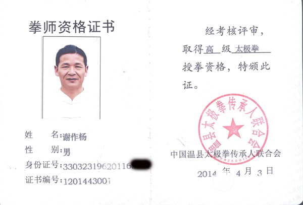 谢作杨,男,1962年出生于浙江温州,现居住温州。师从太极拳大师陈凤英,现任陈金鳌太极拳学会温州分会会长。