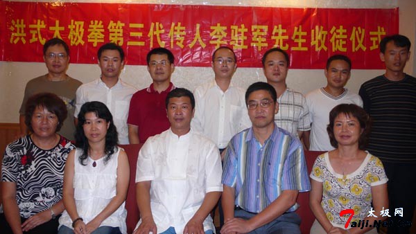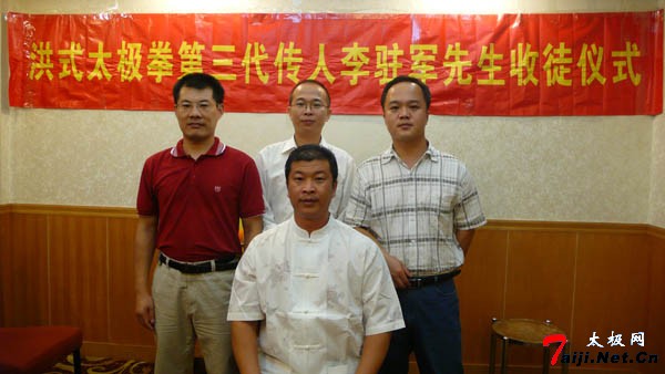 | 8月30日晚8时,李驻军老师收徒仪式在国宾大酒店举行。来自深圳、广州等地的肖磊、陈东旭、司远国三人拜在李驻军先生门下,成为洪式第四代传人。肖磊、陈东旭、司远国三人过去均有不同的拳法基础,后慕李驻军先生之名向先生学习洪式拳法,被李驻军先生人品和拳艺所折服,立誓追随李先生研究洪式拳法,甘愿为洪式拳法的推广贡献自己的力量。 目前,在深圳任一家医药公司经理的肖磊受师命筹建国际洪式太极拳推广中心深圳分会,陈东旭是广州中山大学在读研究生(IMBA),自幼练习散打和传统武术的司远国就职于深圳水务公司。他们在完成自己本职工作和学业之余,为宣传和推广洪式拳法可谓不遗余力,相信在不久的将来,他们将会成为洪式太极拳发展的栋梁。 深圳著名陈式小架传人赵春生先生、香港洪式传人黄丽婵女士、李显明先生到会并向新入门学生祝贺。作为见证人赵春生老师在仪式上首先对李驻军先生多年来为宣传和推广洪式太极拳所取得的成绩表示钦佩,并为肖磊、陈东旭、司远国三人拜到李驻军先生这样的明师,学到科学实用的洪式拳表示祝贺。随后,赵春生老师告诉三位拜师所带来的师生之间关系的一种变化,要求他们今后要尊师重道,刻苦研练,为洪式太极拳在深圳的发展做出贡献。 肖磊作为新入门弟子代表发言,表达了自己和师弟们恩师的崇敬之情,表示今后将携众师兄弟为恩师分忧,为洪式太极拳的推广贡献自己的力量。