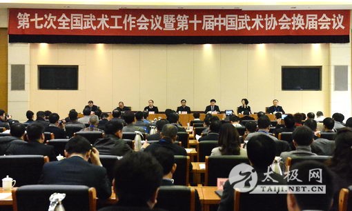 第七次全国武术工作会议暨第十届中国武术协会换届会议于2014年2月25至26日在历史文化名城、著名武术之乡山东省淄博市隆重召开。中国武协副主席、秘书长、副秘书长,各省、自治区、直辖市体育局武术分管领导、武术协会主席、武术中心主任,重点高校武术学院院长,全国武术之乡负责人,总局武术研究院专家委员会专家等100多人出席会议。 出席会议的中国武协领导有:国家体育总局武术运动管理中心主任、中国武协主席高小军,国家体育总局武术运动管理中心党委书记、中国武协副主席何青龙,国家体育总局武术运动管理中心副主任、中国武协副主席邵世伟、王玉龙、陈国荣等;当选中国武协主席、副主席有:高小军连任中国武协主席;(以下按姓氏笔画排序)王玉龙、王茂国、冯潮、刘明、刘建胜、杨凤楼、李克敏、李颖川、何青龙、宋继新、张平、张劲、陈国荣、邵世伟、姚金荣、徐正国、殷宝林、容小宁、晏西征、梁纯、彭德胜、蒋显伦、傅彪担任中国武协副主席;出席会议的专家委员会成员有:著名武术家蔡龙云、习云泰、门惠丰、夏柏华、张山、江百龙、庞林太、杨振铎、刘鸿雁、陈顺安、康戈武等。 25日上午,大会隆重开幕。国家体育总局武术运动管理中心主任、中国武协主席高小军做题为《珍惜机遇,同心协力,努力开创武术事业推广新局面》的工作报告。本次大会主题是:以十八届三中全会精神为指导,坚决贯彻落实刘延东副总理和国家体育总局领导对武术推广工作的重要指示。研究部署新周期加大武术段位制推广为重点的各工作任务。继续在大武术观和标准化建设方针下凝聚力量,以更加高昂的热情全力推进武术事业的大发展、大繁荣。中国武协将深入学习领会十八届三中全会精神,坚决贯彻落实国家领导人和体育总局对武术工作的各项指示,全力以赴推进武术事业发展。探索大武术观理念和标准化建设道路,努力实现五年规划的工作目标。全面启动武术系统新周期各项工作,再创武术事业推广新局面。深刻分析和解决武术事业发展中的问题,以改革的举措积极促进各项工作落实。高主任呼吁大家珍惜历史机遇,树立大武术观和标准化的工作方针,以追求卓越的坚强意志和锲而不舍的钉子精神,努力开创武术事业推广新格局!  国家体育总局武术运动管理中心主任、中国武协主席高小军做题为《珍惜机遇,同心协力,努力开创武术事业推广新局面》的工作报告。