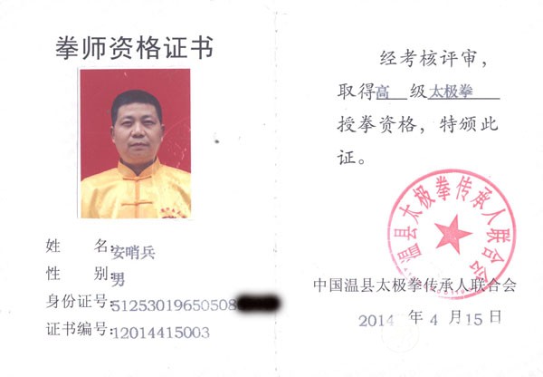安哨兵,男,1965年出生从小就喜欢武术,2004年正式学习陈式太极拳,系统学习了陈式太极拳各种套路,内功,养生功,器械,推手,攻防等技艺,深得恩师的真传。在2012年“照丕杯”中国太极功夫精英赛中获得男子中年组传统陈式太极拳第三名。系恩师陈照森大师的入室弟子,陈式太极拳第十二代正宗传人。