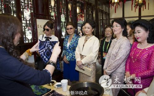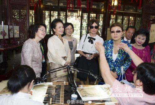 国家主席习近平夫人彭丽媛21日邀请出席亚信上海峰会的部分国家领导人夫人共同观看中国非物质文化遗产展示和文艺演出。 上午,柬埔寨首相夫人文拉妮、吉尔吉斯斯坦总统夫人阿坦巴耶娃、阿塞拜疆总统夫人阿利耶娃、哈萨克斯坦总统女儿纳扎尔巴耶娃抵达豫园,受到彭丽媛热情欢迎。 彭丽媛陪同来宾们观看金山农民画、面塑、顾绣、木版水印、扎染,她们边看边听取上海工艺美术博物馆负责人的介绍,饶有兴趣地欣赏非物质文化遗产传承人的绝活儿,对民间艺术家们的精湛技艺赞不绝口。 在还云楼,彭丽媛和来宾们欣赏少儿歌舞、京剧、昆曲、沪剧、太极拳、书法、剪纸艺术。浓浓的中国元素、精彩的文艺演出,赢得来宾们阵阵掌声。 |