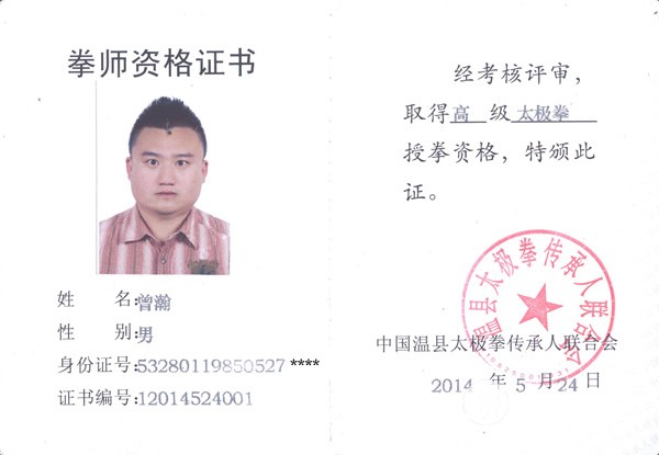 曾瀚(原名曾祺),男,1985年5月27日出生云南版纳,大专,中国武术协会会员,昆明武术协会会员,中国武术四段指导员、考评员,国家二级裁判员,国家二级社会体育指导员。1998年参加西双版纳州陈式太极拳老架培训班,2004年到济南读大学时跟随刘成德大师习练洪传陈式太极拳械,2008年毕业后回到云南跟随云南内家拳馆馆长刘波大师系统学习陈氏老架太极拳械,太极功法及推手至今。2012年至今担任云南内家拳馆助教期间培养了大批太极拳学员,从2008年以来先后荣获云南省第二届,第五届传统武术太极拳械锦标赛比赛青年组二等奖,昆明市第一,二届传统武术太极拳械比赛青年组一等奖,二等奖及第一名,中国丽江首届国际民间传统武术文化节青年组太极拳第三名。先后拜访全国各地的民间武术名家指导学习。