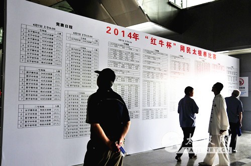 6月7日上午8:30,市委宣传部、市体育局、市互联网协会主办,市武术协会等单位承办的“红牛杯”网民太极拳比赛在市体育中心展览馆开赛。本次活动系“与你e起,精彩无限”2014年无锡市网民公益体育大会的第三项赛事,吸引了全市600余名太极拳爱好者网上报名参与。
