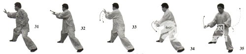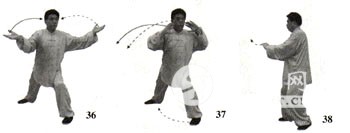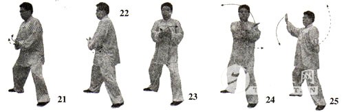 6.举拳提膝 左腿支撑身体,右腿屈膝上提,脚尖微翘起。同时右掌变拳屈臂上举至与鼻同高,拳心向内,拳面向上;左掌落至腹前,掌心向上。目视右拳(图20)。 7.震脚砸拳 接上动,右脚向下在左脚内侧踏地震脚,两脚相距约20厘米。同时,左掌外旋,掌心向上;右拳下落,以右拳背砸击左掌心。目视前下方(图21)。 〔练习要点〕 向左转身掤捋时,要稍向右下转身画弧。转身右捋时,要稍向左上转身画弧。擦脚平推时的左脚擦地铲出与两手向右前画弧平推,虚步撩掌时的右脚向前上成虚步与右掌的前上撩,震脚砸拳时的右拳砸击与右脚下踏震地动作,均要协调一致。同时,两手的内旋、外旋,要有内含的缠丝劲。右脚踏震时,要屈膝松胯,全脚掌着地。震脚砸拳时,上体要保持正直,不可前俯后仰或左右歪斜。 〔呼吸方法〕 转体捋掤时吸气,转身右捋时呼气;擦脚平推的捋掤提脚时吸气,擦脚平推时呼气;虚步撩掌时吸气,虚步砸拳时呼气;举拳提膝时吸气,震脚砸拳时喷气(气以鼻中短促有力地排出,以下均同)。 〔意念方法〕 导引法:转体捋掤时意想气由两手行至丹田;转身右捋时想象丹田内气行至两手。捋掤提脚时意想气由两脚涌泉穴沿两腿内后侧(足三阴经)上行,经会阴穴至丹田(以下简称为两脚至丹田);擦脚平推时,想象内气由丹田向下,经会阴沿两腿外前侧(足三阳经)向下至两脚涌泉穴(以下简称为丹田至两脚)。虚步撩掌时意想气由两手行至丹田;虚步砸拳时想象气由丹田行至两手。提膝举拳时想象内气由两手沿两臂外侧行至百会穴(以下简称为气由两手行至百会);震脚砸拳时想象内气由百会穴沉入丹田。 观想法:转身掤捋和转身右捋时,想象随两手的捋动整个宇宙被搅得天翻地覆、天昏地暗。擦脚平推时,想象脚下好似擦出一条河,掌像推翻一座大山飞速滚向天边。虚步撩掌与虚步砸拳时,想象巨大山体被轻托举起,随拳下砸,使巨大的山体沉入海底。提膝举拳时,想象将地球轻松自如地上提举起;震脚砸拳时,想象脚一踏可震破大地,拳一砸可粉碎巨大的山体。 技击法:设想对方用右拳向我面部击打而来,我右手黏其来拳之腕,左手黏托住其来拳之肘,顺其来劲向右捋推,同时用左脚从对方右腿前绊住向右擦脚使其前跌。当对方后抽右拳时,我借劲用左臂掤击其两臂,并用右掌撩其裆部,接着顺势变拳向上冲击其下颌,用右膝撞其裆,然后再用右脚下踩其左脚。 三、揽扎衣 〔动作歌诀〕 胸前开合阴阳变,转腰旋臂劲内含。 左采右挤随势靠,立身塌腕掌下按。 〔动作方法〕 1.分掌画弧 紧接上势,上体向前、向右旋转,随转腰左掌托右拳向前、向右画 弧。目视右前方(图22)。 上动不停,上体继续向后、向左前旋转,随转腰左掌托拳向后、向左前画弧。目视左前方(图23)。 紧接上势,上体向右转,右拳变掌,手臂内旋使两手臂交叉于胸前, 右手在里内旋、手心向外,左手在外下、掌心向里。目视前方(图24)。 身体继续向右微转,身体重心偏向于右腿。右手向上、向右画弧至右肩前上方,掌心向前,指尖向上;左手向下、向左画弧至左胯旁,掌心向右,指尖向前。目视右前方(图25)。 上动不停,身体稍左转,重心稍向左移。同时,右掌向下、向左画弧至右肋侧前旁,掌心向下,指尖向右;左掌向上、向左画弧至左头侧旁,掌心向右,指尖向上。目视前方(图26)。 2.擦脚合臂 紧接着,身体重心全部移至左腿,左腿支撑身体,右腿屈膝向上提,脚尖自然下垂。同时,左掌向右、向下画弧至右胸前,右掌向下、向右上画弧至左胸前,两掌交叉于胸前,左掌在里,右掌在外,两掌掌心均向里,指尖均斜向外。目视右掌方向(图27)。 身体稍向左转,左腿屈膝下蹲,右脚以脚跟内侧贴地向右铲出。同时,两掌交叉于胸前稍向左前撑。目视右前方(图28)。 3.马步立掌 右脚前掌着地踏实,重心开始右移。左掌内旋翻成掌心向外,指尖斜向上,两掌仍交叉于胸前。目视前方(图29)。 上动不停,身体重心右移,上体右转。随转体,右掌向上、向右画弧至右肩前,掌心向前,指尖斜向左;左掌附于右大臂内侧,掌心向右,拇指侧向里。目视右掌方(图30)。 身体重心继续右移成右偏马步,上体随之向右转体。随转体右手向右下画弧至右侧方,前臂外旋,塌腕立掌,掌心向右,指尖向上,腕与肩同高;左手向下、向左屈肘叉于左腰侧,虎口向里,掌心向下。目视右手(图31)。 〔练习要点〕 在整个揽扎衣动作过程中,身法的变换是向左、向右的两个“回旋”,同时以腰转动带动两臂左右缠绕。右脚铲出与两手胸前搭腕要协调一致。揽扎衣动作定势时,沉肩垂肘,旋臂塌腕,敛臀圆裆,松腰沉胯。 〔呼吸方法〕 分掌画弧时吸气,擦脚搭腕时呼气。身体左转、马步立掌前的右掌内旋时吸气,马步立掌时呼气。 〔意念方法〕 导引法:分掌画弧时想象气由两掌行至丹田,擦脚搭腕时想象丹田内气行至两脚,马步立掌前的右掌内旋时想象气由两脚行至丹田,马步侧掌时想象丹田内气行至两掌。 观想法:分掌画弧时,想象宇宙被两臂缠绕旋转起来。擦脚搭腕时,想象脚下擦出一条大河,日月星辰被揽抱于怀中。马步侧掌时,想象大山被推按塌陷于地球之中。 技击法:设想对方左拳向我打来,我用右臂由里向外拦挡其臂,左手抓握其手腕,上步近身,顺势用肩靠肘顶,手扑其面部。 四、六封四闭 〔动作歌诀〕 六封四闭捋采变,捋展掤合两掌间。 上引下松气随意,跟步闭中双掌按。 〔动作方法〕 1.转