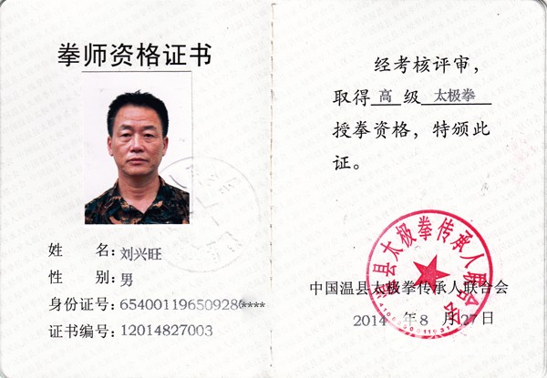 刘兴旺 1965年9月出生 中共党员 大专学历 从小酷爱武术,9岁至17岁跟随新疆奎屯市武术协会、太极协会主席傅合义师傅学习梅花拳、戳脚翻子拳、鹰爪拳,传统陈氏、杨氏太极拳及竞赛套路拳剑。 31岁至今跟随河南焦作市人称郑州三张的陈式太极拳十一代正宗传人张其林大师(陈照奎宗师的亲传弟子),学习陈式太极拳家传功夫架八十三式、七十一式、二十六式、太极推手、擒拿;并拜师现已是陈式太极拳第十二代正宗传承人,并取得太极拳师高级资格证书,国际太极拳高级教练资格证,国家武术二级裁判员证。 被中华太极拳传承人联合会评选为当代太极拳名家;已经获得中国武术六段、中国武术段位评审员、指导员、中国武术协会会员、现任新疆奎屯市武术协会副主席、太极协会副主席.中国河南焦作陈照奎拳术研究会副会长,新疆分会会长。 2012年8月参加中国陈家沟举办的首届太极拳国际交流大赛中荣获陈式太极拳个人一等奖、集体一等奖。 2013年带徒弟和学生参加新疆举办的第四届陈式太极拳比赛荣获个人一等奖四个,二等奖五个,荣获陈式太极拳集体一等奖。 2014年带徒弟和学生参加新疆伊犁州成立六十周年太极拳运动会,获得个人十四个拳,剑一等奖,集体拳,剑一等奖。 2015年亲传弟子韩玉兰、张俊两人参加首届国际太极拳网络视频大赛分别荣获陈氏太极拳个人二等奖的好成绩。 2016年6月17曰带领徒弟参加新疆武术协会举办的全疆太极拳比赛荣获金牌8枚、银牌9枚、铜牌12枚。本人连续多年担任市里举办的太极拳比赛裁判长,裁判及新疆武术协会举办的全疆太极拳比赛裁判 。 2016年,我的两位徒弟韩玉兰、张俊参加陈家沟第三届太极拳国际交流大赛分别荣获金奖。 2016年8月带徒弟代表奎屯市参加伊犁州首届武术比赛荣获个人四枚金牌、两枚银牌、集体一等奖。 2016年本人被太极网,中华太极联合会评选为十大影响力人物。 刘兴旺拳照