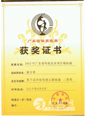 本人自小酷爱武术,青少年时开始习练外家拳,气功等。 2002年向一代宗师冯志强大师入室弟子黄光明老师学习心意混元太极拳及混元功。并多次上北京参加混元太极高级培训班,得到冯志强大师的精心指导。 2003年跟随陈向寅老师习练传统陈式太极拳老架,小架,竞赛套路,刀,剑,枪,春秋大刀,推手,散手等,对陈式太极拳理论造诣颇深,功力深厚,尤其对太极拳养生更深有研究,经多年的教学实践,整编了一套具有独特风格和养生效果的养生功《极益太极养生功》,更是得到高度的认可和大力的推广。 2006年正式拜师,成为陈氏太极拳第十三代传人。 2007年在汕头市“永衡”杯粤东,深,港,澳武术大赛荣获传统套路金奖,传统单剑金奖,单刀金奖。 2008年广东省传统武术项目锦标赛荣获男子传统套路金牌,国家竞赛套路金奖,单剑金奖。 2011年大潮汕“邓老凉茶”杯武术百馆精英大赛 荣获集体一等奖,竞赛套路二等奖,单剑一等奖,传统太极拳一等奖。 2013年广东省传统武术锦标赛荣获男子传统太极拳一等奖,集体一等奖,竞赛套路二等奖,单剑一等奖。 2014年经河南温县太极拳传承人联合会考核评审取得高级拳师资格。同年开始被多家学校聘请进校开设太极拳课堂,以“弘扬太极文化,增强学生体质”为目的,深受好评!多次组织参加表演和比赛均取得优异成绩。 2015年广东省第八届武术精英大赛(广州总赛区)荣获集体金奖,国家规定竞赛套路银奖,单剑金奖,传统太极拳金奖。 2015年广东省第八届武术精英大赛(粤东赛区)荣获国家规定竞赛套路金奖,陈式单剑金奖,陈式单刀金奖、陈式太极棍银奖、陈式传统太极拳金奖。 2015年广东省粤东首届健康运动大会荣获国家规定竞赛套路金奖,陈式单剑金奖,陈式太极棍银奖、陈式传统太极拳金奖。 2016年饶平县老干部(老年)大学开办太极养生专业班,被聘任为专职教师。向离休老干部传授太极养生功及太极拳,更是受到一致的认可和好评! 中国武术协会会员,广东省武术协会会员,中国武术段位六段,国家二级裁判员。 汕头市武术协会理事,一级教练员、一级武师。 林吉春获奖证书 林吉春陈式竞赛套路 林吉春陈式太极单剑 |