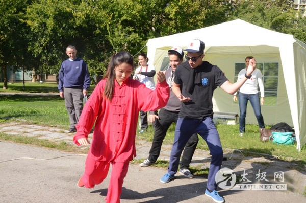 27日,孔子学院日当天,塞尔维亚诺维萨德大学孔子学院的师生们与诺维萨德市民们一起舞动太极拳,传播中国文化,为孔子学院庆生。 27日下午,诺维萨德大学孔子学院外的广场上,数十名塞尔维亚太极拳爱好者和诺市市民,在中国老师的示范下,伴着悠扬舒缓的音乐,一招一式地演练起太极拳的动作。 虽然他们中间很多人是第一次亲自舞动太极招式,动作难免生涩,可他们那全神贯注的劲头却让人甚为钦佩。对于诺维萨德大学哲学院的学生戈尔迪奇来说,打太极拳是一次全新的体验,一套动作模仿下来,她最大的感觉就是:“非常有意思!之前我从没过打太极拳,今天第一次尝试,感觉很棒,很健康,对我身心状态的调整很有帮助。” 队伍中间有几名作为领拳者的孔院学生,身穿宽大飘逸的太极服,格外惹眼。虽然他们学习太极拳仅有两三个月,但一招一式却打得有模有样。比如其中的德亚娜和塔田娜这对亲姐妹,她们把自己对太极奥义的理解讲得头头是道: “和谐是太极动作最大的特点,这也是中国作为国家给我们留下的深刻印象。练习太极对身体很有好处,能够帮助我更好地应对每日的压力,获得一种内心上的平静。” “太极不仅具有保健功效,也让人的境界得到升华。对那些精益求精的人来说,一个动作就足以穷其一生来钻研和完善。换句话说,太极的魅力不在于自身的完美,而是它本身不断追求化境的进取过程。” 诺维萨德大学孔院学生能够打好太极,除了太极自身的魅力外,负责教习太极拳的志愿者教师陈风兰也是功不可没。她在与记者分享感受时说道,李小龙和成龙的很多功夫片让塞尔维亚学生对中国武术充满向往。但对于太极拳,一些人却在短暂的新鲜感过后倾向于放弃。由于动作的难度和舒缓的节奏,让一些好动的热血青年很容易在遇到困难时浅尝辄止。正是陈风兰的循循善诱和耐心教导,让学生们真正喜欢上了这项“特殊的武术”并坚持下来。 “太极拳看似很简单,但真正做起来还是很有难度,特别是(很考验)协调性,也很耗体力。(他们)第一节课觉得好玩,会有很多人过来。因为不是一下就能学会的,上了一两节课,有的人就觉得太难要放弃。他们觉得太极拳太慢,就问‘老师我们能不能学别的武术’,他们还说‘太极拳不是武术,(因为)武术没有这么慢的’。我就跟他们说,太极拳是武术,包括以前人们用它来打斗。但现在它的功效主要在于修身养性,对人(身)体是特别好的锻炼。然后就有学生这样一直坚持学完,我也觉得很开心。” 据孔院老师介绍,在诺维萨德,生活着一些上年纪的太极拳爱好者,他们一般会三五成群在公园内练习,但像这样数十人一起操练太极拳的场面却是一道并不常见的风景。路过的市民或放慢脚步,或驻足观赏,还有一些索性加入到太极拳操练者的队伍中,亲自比划起来。市民托米斯拉夫说:“这是我第一次学打太极。完全没有准备就跟着练起来了。看来还得有一身宽松的衣服打起来更舒展。之前我在电影里也看过太极和功夫的场景,那个动作很快,而实际似乎并不是这样,因为我今天打的太极动作很慢,对平衡要求很高,招式复杂但很飘逸,也很有技术含量,大家都来学吧!” 示范推广,吸引更多爱好者来学习太极拳,并让他们从亲身参与中体验和领略中国文化的魅力,这正是诺维萨德大学孔子学院举行此次活动的初衷。每一位参加太极拳操练的市民,都得到了一件印有孔子学院标志的文化衫。指着胸前的孔院标志,戈尔迪奇兴奋地对记者说:“我今天得到的不仅仅是一件礼物,也收获了对于了解中国文化和学习汉语的兴趣。我很感谢孔子学院给了我这样一次了解中国文化的机会。在不久的将来,或许你下次见到我时,我已经是孔子学院的一名学生了。” |
