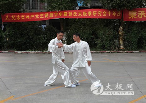 10月8日台州市武术协会贺氏太极拳分会,在台州黄岩举行纪念贺鸣声诞辰100周年活动。中国武术专家委员、中国武术九段、十大武术名教授夏柏华,中国武术专家委员、中国武术九段、十大武术名教练、省武术协会副会长陈顺安,牛春明外甥、春明太极拳馆馆长孟宪民、中国武术台州基地主任、台州市武术协会常务副会长卢仙春、台州市武术协会秘书长宋炳初、副会长符鹤龄、刘显法、奚增义,贺氏太极拳分会陈颖、陈驺、陈彬,以及贺鸣声先生的弟子和二三带弟子100多人参加了本次纪念活动。 贺鸣声先生是一位优秀的武术家、艺术家和革命家,1915年出生于台州市椒江区,自幼酷爱武术运动,精通台州民间武术,1933年师从乐清金心泉先生学习拦门橛、拳术和气功,打下了良好的武术基础。 青年时期,贺鸣声先生进入浙江省国术馆习练少林、武当、形意、八卦及刀枪剑棍等多种拳械,适逢杨澄浦公带领田兆麟、牛春明、李雅轩等弟子南下教拳传艺,贺鸣声先生便师从于田兆麟学习杨式、陈式太极拳和推手等拳术,时值杨澄浦先生担任国术馆教务长一职,贺鸣声又得到了杨澄浦公的精心指点,受益匪浅,功底更为扎实,同时随北派罗汉门大师刘百川习子母鸳鸯连环腿,从学于武当门高振东习形意拳,后因考取了上海市美术学院而离去。1938年奔赴延安,进陕北工学院学习,再到鲁迅艺术学院深造,在木刻版画方面取得了较高的造诣,后回到台州,积极参加地下党工作,投身到革命解放事业中去。 1950年,贺鸣声先生分配至浙江省文化厅工作,便拜杨澄浦公正传弟子牛春明先生为师,从此在恩师的精心指导下,“夏练三伏,冬练三九”,每天清晨在西子湖畔的六公园盘架,练习推手,深悟太极拳技击和实用真谛,功夫日精。1958年因受到“左倾”势力压迫,贺鸣声先生蒙冤被下放到温州市艺术学校任教,即使政治环境恶劣,他仍坚持练功,数十年如一日,苦练不辍,同时又担任了温州市武术协会教练和顾问。他的学生遍布温州、杭州、台州等地。贺鸣声先生根据多年的习武心得,取长补短,武术拳法逐渐形成了自己独特的风格,被学生们尊称为“贺氏拳法”。 1982年,贺鸣声先生参加浙江省老拳师武术表演赛并获奖,同时为了响应国家发掘中华传统武术号召,他无私地将几乎失传的“拦门橛”图献、其他一些武术拳谱及本人多年的武术心得笔记,贡献给大会,一时传为佳话。 1984年,在政治问题昭雪后二年,贺鸣声先生不幸病逝。 2005年,在台州市武术协会的关怀下,成立了“贺氏太极拳研究会”,旨在进一步发扬贺鸣声先生的太极拳技艺,为全民健身作出贡献。 贺氏太极拳练习特点:动作大方舒展,拳架左右平衡协调,并蕴藏着太极内功运行,明劲透彻,柔化缠绵,轻松自随,悬浮沉稳,外练筋骨皮内练精神气,结合人体五行相生相克、相辅相成的经络学说和现代人体解剖原理,进一步发扬杨式太极拳的技击与健身功法。 |