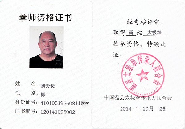 刘天长,中国武术六段、国家武术二级裁判员、国家高级太极拳拳师、陈氏太极拳高级教练、国家高级社会体育指导员、中国武术段位制考评员、指导员、中华太极拳杰出传承人。1956年生,河南省郑州市人,自幼习武,先后得到刘晴午、陈德林、陈小旺、陈正雷、张东武、徐勤兰、周建勋、朱强等太极名家的指导,2011年拜中国陈家沟陈氏二十世、太极拳第十二代嫡宗传人张东武先生为师。曾多次参加国内外武术比赛并多次获得奖牌。功夫纯正,技术全面,对陈氏太极拳教学训练及实战技法有独到的见解。常年致力于太极拳的推广与教学工作。 刘天长所获奖牌及征收 |