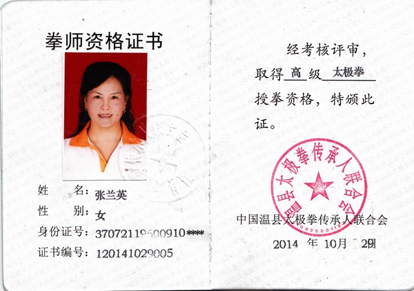 张兰英,女,汉族,中国武术六段,现任潍坊太极拳协会常务理事,自幼酷爱武术,随沙学周、济南王代友习武多年,曾任青州猛龙武术馆和樱花日语学校太极拳教练。先后获国际、全国、省、市武术太极拳锦标赛等多项金、银、铜大奖,现是中国当代“十大武术名师”陈氏太极拳十一代嫡宗传人陈正雷大师之弟子。是国家武术太极拳、剑、推手二级教练员、裁判员,省武术太极拳、剑、推手高级教练员、裁判员,多次参加省高级教练员培训班。 2004年10月参加济南李恩玖陈式传统教练员培训班; |