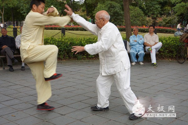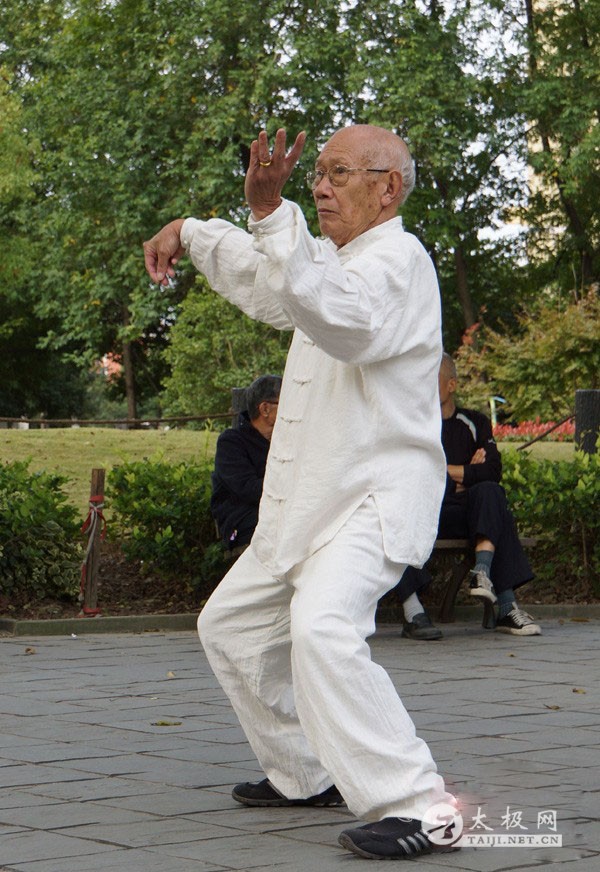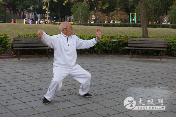 作为四大国粹之首的中华武术(四大国粹:武术,中医,京剧,书画)在我国改革开放的三十多年间,发展迅速。特别是武术中的重要拳种——太极拳,在国内外的传播发展更是史无前例。太极拳正在打造成为世界第一健身品牌。 在全民健身活动中,我国参与太极拳锻炼的人数一直居于前茅。随着我国老年化社会发展的增速,太极拳作为一种男女老少皆宜的终身体育健身运动,也越发受到老年人群的青睐。许多老年人通过持之以恒的太极拳锻炼获得了健康,过着幸福且有质量的老年生活。这无疑是积极应对老年化社会的积极手段之一。 记者最近走访了本市徐汇区田林街道中心绿地的一位常式太极拳传人蔡锡祺老先生。今年是他米寿之年(88岁),现已成为当地有名的健康老人和太极拳老师。年近90的蔡老师看上去双眼炯炯有神,手脚灵活自如,与一般同龄人迥然不同。记者在现场录下了他演练的108势常式太极拳大功架全套套路,(请见视频)。一套十几分钟的拳打下来,他气不喘,腿不软,潇洒自如。从视频中可见,他的“单鞭”,“下势”动作以及“金鸡独立”和“蹬脚”,“分脚”动作依然能取较低架势,说明他身体的柔韧性和平衡能力,非一般老年人能所及。问起他的练拳经历,使记者感到有责任介绍给广大网友,对爱好或即将爱好太极拳的人们有所启迪。 上图:蔡锡祺2013年拳照 上图:蔡锡祺老师2007年教拳照 上图:2014年蔡锡祺老师与学生练习推手 从重病号到太极推手冠军 和许多太极拳爱好者和受益者的经历相仿,蔡老师年轻时也曾是个重病号。他在上海新华金笔厂工作,1964年,因工作关系,得了严重的铅中毒职业病,吃不好睡不着,整天头昏脑胀,无法正常工作和生活,并出现了瘫痪的前兆症状,在厂里是人人皆知的重病号。在疗养院治疗后也没见大的起色。后来他妻子吴菊秀鼓励他到公园去活动活动,也许对康复有好处。于是,他在和平公园开始学起杨式太极拳传统套路(85式),经过一段艰苦的入门锻炼,配合药物治疗和合理的生活方式,健康状况逐步有了好转。这增强了他学练太极拳的信心和决心。那时,他才38岁。后来他得知浦东有个太极拳高手、常式太极拳的第三代传人马殿臣。马殿臣于1963年获上海市首届太极拳推手冠军,名重武林。此时已有杨式太极拳基础的蔡锡祺求知心切,每周三个晚上带着小儿子一起从杨浦区过黄浦江到马殿臣家学习常式太极拳和推手,坚持了八个寒暑岁月,终于学得了一身常式太极拳的好功夫。他与马老师一样,是上海市太极拳推手比赛两次冠军,一次亚军的得主。更欣慰的是他的健康状况也越来越好,并彻底丢掉了病号帽子。他在和平公园开始传授此拳。搬到田林新村十二村后,又在田林新村中心绿地推广此拳。至今已坚持了50年的太极生涯。目前他已是桃李满天下的太极拳老师,成为常式太极拳的第四代传人。
