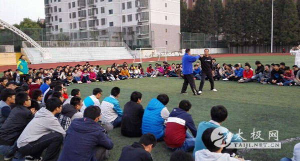 | 2014年11月12日下午,为响应国家“武术进校园”的倡议,促进大学生的身心健康,富光•世清太极应安徽省合肥市建筑工业大学邀请,为大学生们教授陈氏太极拳养生精要十八式,分四个班共一百七十多名学生,由富光•世清太极教练员周斐,张志静,方霞,倪良宝任教,馆长倪世清亲自指导,并示范讲解拆招解招。为了让大家学习更有兴趣,各班将在学习结束后展开太极拳竞赛活动,充分调动了大家学习的热情 ,最后,倪世清鼓励大学生们坚持学好中国这一传统文化瑰宝——太极拳,将我国的国粹世代传承。 |