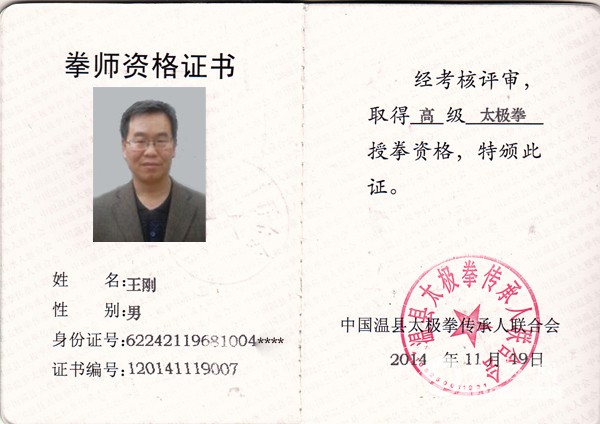王刚,男,1968年10月4日出生,中共党员,毕业于第四军医大学临床专业,自92年在兰州陆军总院从事神经外科临床工作至今,主任医师,本科学历。 2003-2005年习练杨氏太极拳统编套路,2006-2008是从杨氏太极拳第六代传人王志勇老师习练杨氏太极传统套路85式。2008年喜迎奥运甘肃省武术协会太极拳邀请赛上获得杨氏太极拳竞赛套路42式第一名。武当太极剑第一名。2009至今年师从刘建华师傅习练陈式太极拳。2010年在定西市武协举办的中国传统武术展演会上获得陈式太极拳56式第一名。陈氏太极剑第三名。在2011年甘肃省太极拳邀请赛上获得陈式太极拳竞赛套路56式第一名,陈氏49式太极剑第一名。2014年全国传统武术选拔赛上获得陈式太极拳自编套路一等奖,太极剑一等奖,2014年10月在武当山举办的杨氏太极拳高峰论坛武术展演会上获得陈式太极拳36式一等奖,太极剑二等奖。2014年被甘肃建筑学院聘请为太极教练,普及了该校师生杨氏太极拳竞赛套路24式、陈氏56式。 本人兼职甘肃省太极拳协会副会长,兼甘肃省太极拳协会小西湖辅导站站长,武术5段,2014年10月8-9号通过武术六段理论,段位单练、对练,考试得分93.38分,考试成绩名列前十位,六段正在审批中。2010年开始带学员共计177人。2013年被聘为陆军总院离退休职工活动中心太极拳辅导员。 拳照 |