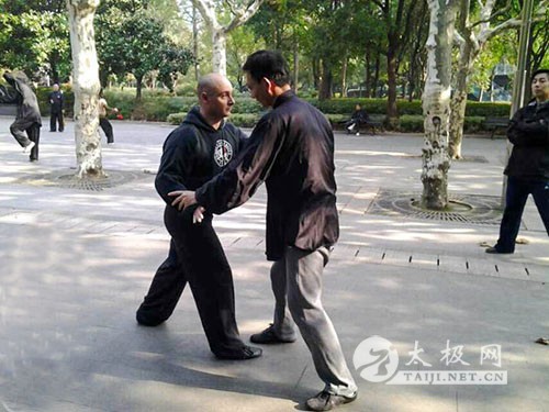 坐落在上海市衡山路宛平路的徐家汇公园,爱好太极拳的人们都知道有一位名叫张平的陈式太极拳老师,他每天在那里教授武术爱好者练习陈式太极拳。图为他正在指导学员和意大利武术爱好者习练陈式太极拳推手,教授陈式太极拳。 张平是陈氏太极拳第12代传人、太极拳大师马虹先生入室弟子,现在也是上海市徐汇区武术专业委员会委员,他曾经带率领上海队参加中国传统太极拳邀请赛,与近70支参赛队伍的激烈竞争,取得男子组团体、女子组拳术、青年组器械刀、老年组器械刀等四个项目的冠军。作为陈氏太极拳在上海的拳师,张平靠着他务实认真的教学方法、详实精准的拳术理论吸引了上海众多太极拳爱好者。现在他的弟子已经桃李满天下。慕名而来的爱好者纷至沓来,连老外也前来学习太极拳,纷纷表示要拜张平为师。 张平这个东北大汉通过自己的辛勤努力,让上海人所熟悉的陈氏太极拳逐渐成为了中青年所钟爱的一项健身运动。 |