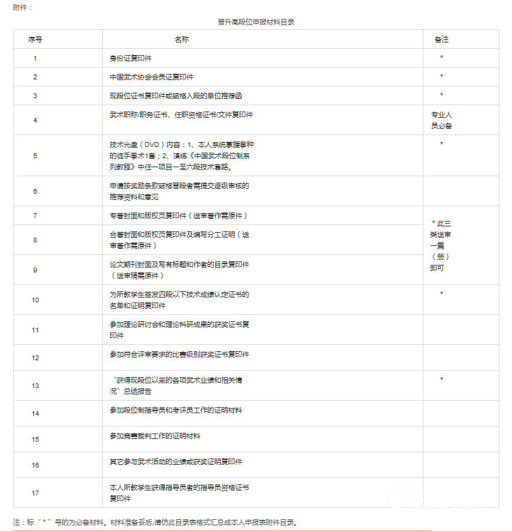 体育总局武术中心关于2015年度 晋升八段和九段申报工作的通知 各省、自治区、直辖市、计划单列市、新疆生产建设兵团体育局武术运动管理中心(武术管理部门),各行业体协武术管理部门,中国武术协会各单位会员: 经国家体育总局武术运动管理中心研究决定,现将2015年度八段和九段申报工作有关事宜通知如下: 1.申报时间:于2014年12月22日开始,至2015年1月22日截止(以邮戳为准)。具体程序参见《中国武术段位制手册(增订本)》第112页——个人申报段位流程。 2.申报资格与材料准备:本次申报范围为八段、九段。请申报者参见《中国武术段位制手册》第34--44页《高段位考评办法》相关要求进行申报。 3.申报要点: (1)各单位应严格把好初评关,申报者必须达到申报条件,资格不够或资料不全者不得申报。 (2)获得现段位后,是否继续参与武术活动,为推动武术推广普及发展不懈努力,重点看申报者为加快武术段位制标准化管理体系建设中作出的努力和成绩。 4.上报材料及评审费:请各一级会员单位将申报材料(见附件)与2张近期免冠照片邮寄至中国武协段位制办公室;同时,登陆“中国武术段位制官方网站”进入“晋段申报系统”进行网络申报。评审费180元汇至中国武术协会账号(如他人代寄请附言注明): 户 名:国家体育总局武术运动管理中心 开户行:工行北京体育馆路支行 帐 号:0200008109026408218 5.相关文件下载: 《中国武术段位制手册》、《中国武术段位制》申报表与《中国武术段位制》高段位考评办法下载: 中国武术协会网站:http://www.wushu.com.cn/ 中国武术段位制官方网站http://dw.wushu.com.cn/ 联系方式: 国家体育总局武术运动管理中心段位制办公室 地 址:北京市朝阳区安定路3号; 邮 编:100029 联系人:张路平 陈晓卉 电 话:010-64912437,64912172 传 真:010-64912437,64912172 Email:duanweiban@126.com |