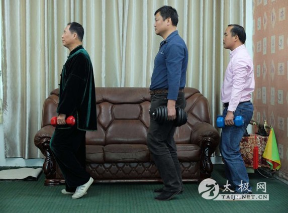练习沉顶对拔劲功法是初级入门阶段的功课,主要有两个功效。一是练出虚领顶劲的功夫;二是把沉顶对拔劲的功夫练在骨骼上。另外在健身祛病方面,对肩周炎、颈椎炎的辅助治疗和康复确有实效,比医院的牵引理疗要好。 一、体悟虚领顶劲与练出虚领顶劲的功夫 两手各拿一个10至20磅重的哑铃,视性别、体重、年龄而定,一般的女性成年人,大约10磅一个的哑铃就合适了。一般的男性成年人,大约15磅一个的哑铃就合适了。两脚与肩同宽,膝部微曲。上要虚领顶劲、松肩垂手,中要松腰塌胯,尾闾下坠,下要放松膝、踝关节,往下沉到脚底地面。至于实际怎样松腰、松胯、松膝,言传身教的面授效果比较好。除了拿哑铃的手指、手掌恰到好处的用点力之外,其余肢体能放松的就尽量松开,练习大约3至5分钟。当肩、腰沉到累了不大好受得时候,颈椎松开的脖子上伸,脖子上伸一点就会感觉肢体舒服一点,由松沉重量感下压身体造成的虚领顶劲就会自然出现,沉顶对拔劲松开的功夫就是这样长出来了。 二、体悟肌肉力、骨力与把沉顶对拔劲的功夫练在骨骼上 怎样体悟肌肉力、骨力呢?两手各拿一个哑铃,立身中正的稳静站立,通过松腰、松胯、松膝的沉到实腿脚跟中心,虚腿的脚尖轻轻点地,实腿往下松沉的同时带动提起虚腿的脚跟、脚掌离地,虚腿实腿的比例大约是1:9。当你头顶百会穴与实腿脚跟垂直的上下贯穿时,你会感觉到股骨、胫骨力达脚跟中心,小腿、大腿、臀部、腰背的肌肉不用力或者不怎么用力,这是骨骼用力的支撑作用。在初级阶段的练功,这样以骨力较多而肌肉力较少的感觉也算是骨力的体悟了,功夫练在骨骼上,是练习太极拳而追求的东西。当你头顶百会穴与实腿脚跟不是垂直的上下贯穿时,你则感觉这样站立较为费力,股骨、膝盖、胫骨和小腿、大腿、臀部、腰背的肌肉都同时用力(肌肉用力时较紧较硬)达到于脚跟中心或者脚跟与脚掌之间,这是骨力和肌肉力混合一起的支撑作用。这样以肌肉力较多而骨力较少或肌肉力、骨力各有一半都算是以肌肉力为主的动作,功夫错练在肌肉上了,不是练习太极拳而追求的东西。 如有了骨力体悟之后,接着保持立身中正、沉顶对拔劲的态势和身法,往前小步行走了7至10步又往后退走7至10步。技术要求是:身势沉稳,虚实分明、脚步轻灵,行走时身法不变形,沉顶对拔劲自始至终的贯穿。肩、腰沉到累了不大好受得时候,稍作停顿使颈椎往上松开,脖子自然上伸,在这样以松换劲的过程长出功夫。 三、让沉顶对拔劲和骨力动作留在徒手拳势身上 不拿哑铃之后,注意找回手拿哑铃练功的感觉,试试空手的拳势(如“揽雀尾”、“搂膝拗步”、“如封似闭”等等)是否还有多少沉顶对拔劲?还有多少使用骨力贯串脚跟的动作?要反反复复的练习,直到沉顶对拔劲和骨骼劲力长在徒手拳势身上为止。 |