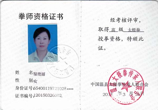 陈式太极拳传人梁艳丽荣获太极拳高级拳师证书